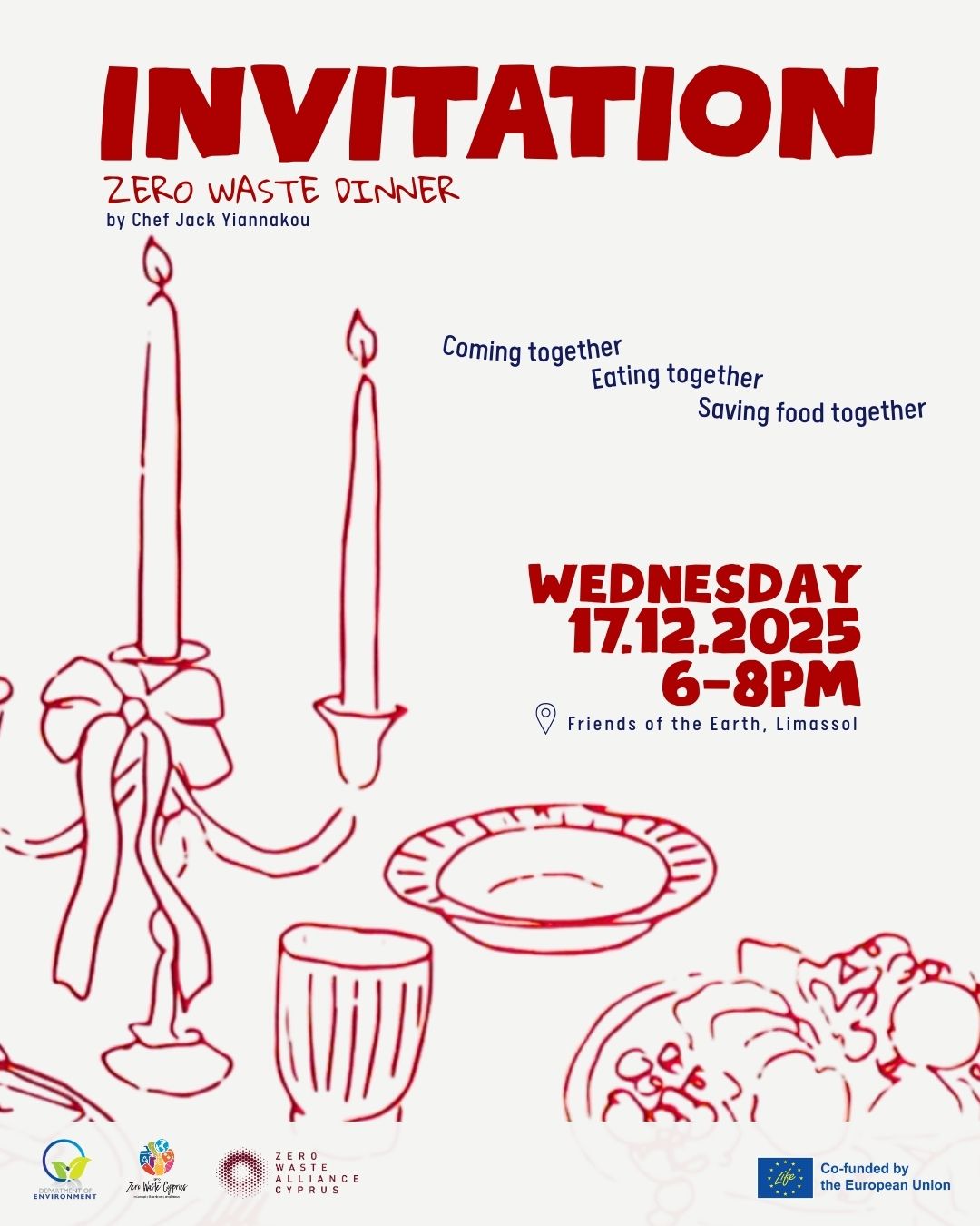 Για να αναδείξει πώς αυτό εφαρμόζεται στην πράξη, το LIFE IP Zero Waste Cyprus, στο πλαίσιο της συνεργασίας του με το Zero Waste Alliance Cyprus (Δράση C4), διοργανώνει ένα Δείπνο Μηδενικών Αποβλήτων.